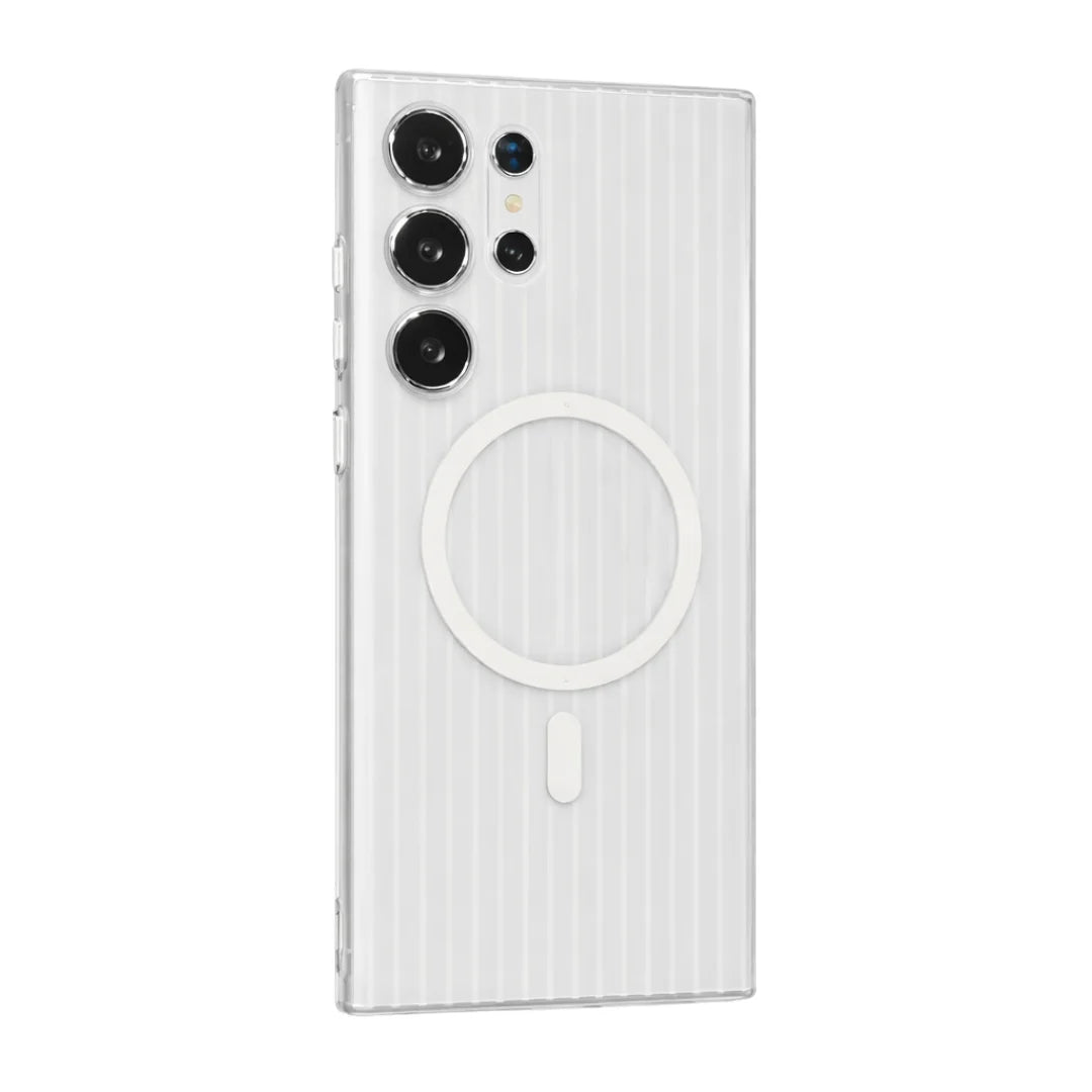 | Product Name | Transparent MagSafe Compatible Striped Shockproof Case – Black & White Accent |
