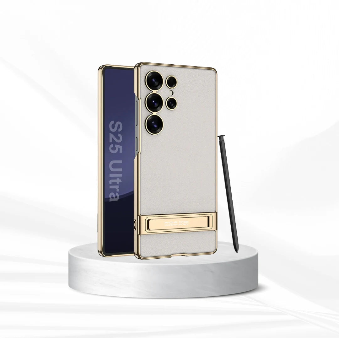 Introducing the "Electroplated Plain Leather Triumph Stand Case" for Samsung – a triumphant combination of sleek design, electroplated accents, genuine leather, and a versatile stand feature. Elevate your Samsung experience with this case that seamlessly blends style and functionality.